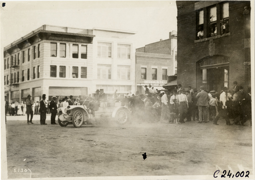View of motorists in car pulling away from a brick building during the 1910 Glidden Tour. Spectators stand nearby; commercial buildings in background. Stamped on back: "Spooner & Wells, Inc., photographers, telephone North 1745. 1231 Woodward Ave., Detroit, Mich. Detroit, 1231 Woodward, New York, 1931 Broadway." Handwritten on back: "Tours--Glidden Tour, 1910."