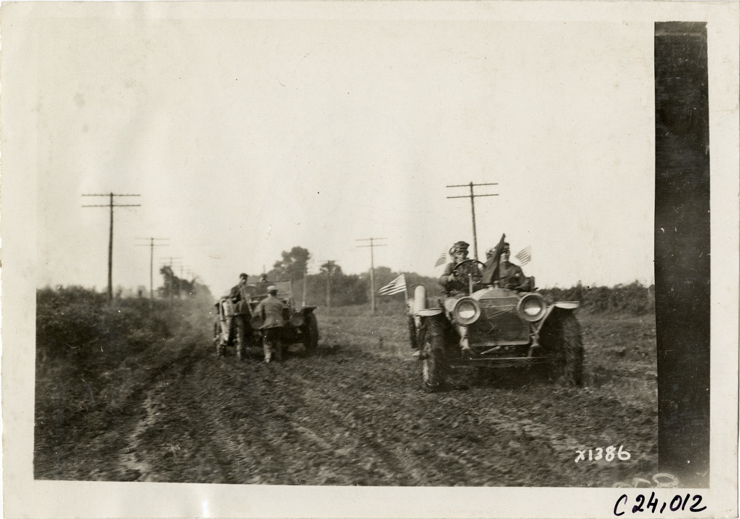 View of motorists in Cadillac car traveling on muddy rural road, followed by another car, during the 1910 Glidden Tour. Stamped on back: "Spooner & Wells, Inc., photographers, telephone North 1745. 1231 Woodward Ave., Detroit, Mich. Detroit, 1231 Woodward, New York, 1931 Broadway." Handwritten on back: "Tours--Glidden Tour, 1910."