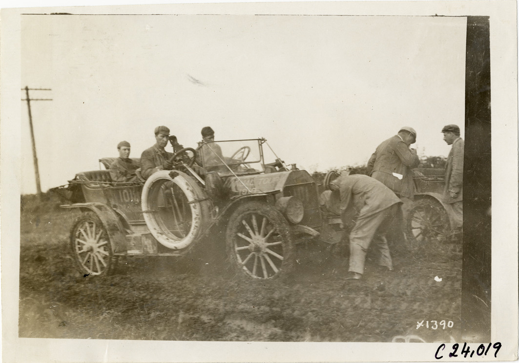 View of motorists with Moline car no. 101 on muddy rural road during the 1910 Glidden Tour. Stamped on back: "Spooner & Wells, Inc., photographers, telephone North 1745. 1231 Woodward Ave., Detroit, Mich. Detroit, 1231 Woodward, New York, 1931 Broadway." Handwritten on back: "Tours--Glidden Tour, 1910."