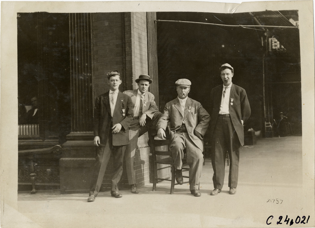 Favorite this☆ Diamond tires crew, 1910 Glidden Tour Description: View of Diamond tires crew during the 1910 Glidden Tour. Four men wear suits, hats and have medals pinned to their lapels. Handwritten on back: "Diamond tire crews. Tours--Glidden Tour, 1910." Details Resource ID: na025253 Subject: Tire industry--Employees Portraits, Group Glidden Tour (1910) Automobile driving--Competitions--United States Photographic prints Date Issued: 1910 Format: 1 photographic print ; 5 x 7 in. Member of: National Automotive History Collection Lazarnick Collection Filing Location: Tours--Glidden Tour, 1910 #27 Negative Number: Negative #C24,021 Rights: Physical rights are retained by DPL. Copyright is retained in accordance with U.S. copyright laws.