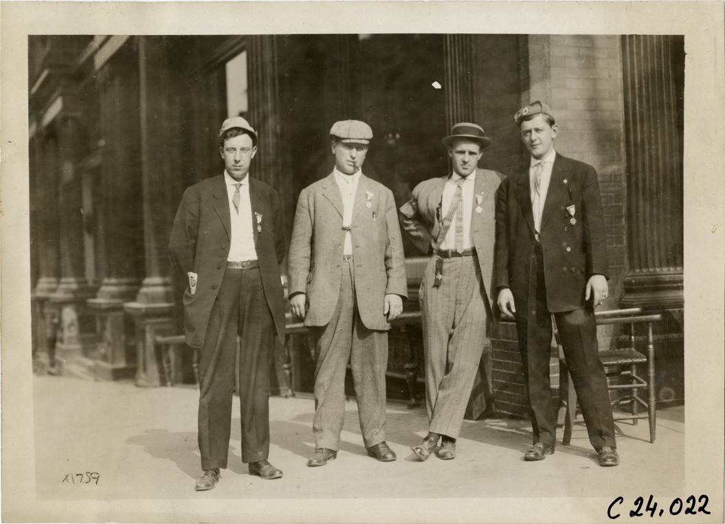 View of Diamond tires crew during the 1910 Glidden Tour. Four men wear suits, hats and have medals pinned to their lapels. Handwritten on back: "Diamond tire crews. Tours--Glidden Tour, 1910."