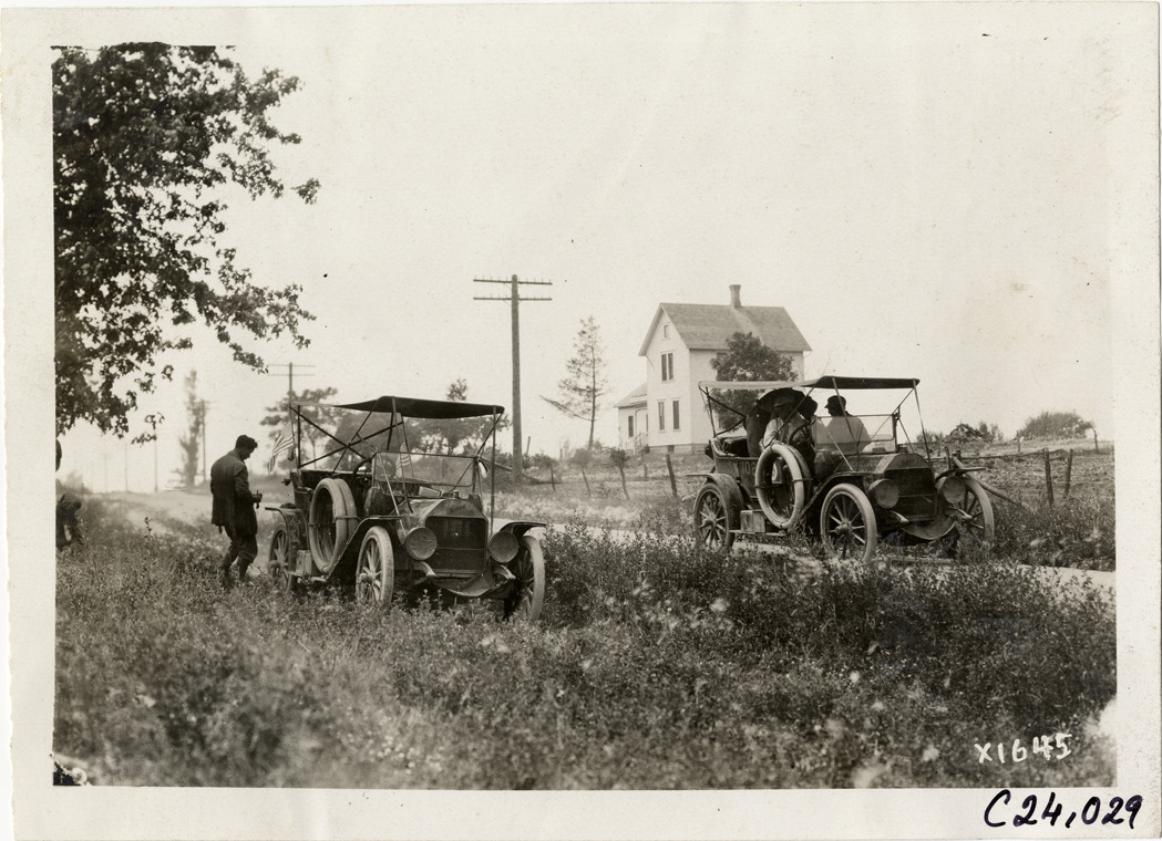 View of motorists in Moline car no. 102 passing Moline car no. 101 on side of rural dirt road during the 1910 Glidden Tour. Wooden-frame house in background. Stamped on back: "Spooner & Wells, Inc., photographers, telephone North 1745. 1231 Woodward Ave., Detroit, Mich. Detroit, 1231 Woodward, New York, 1931 Broadway." Handwritten on back: "Tours--Glidden Tour, 1910."