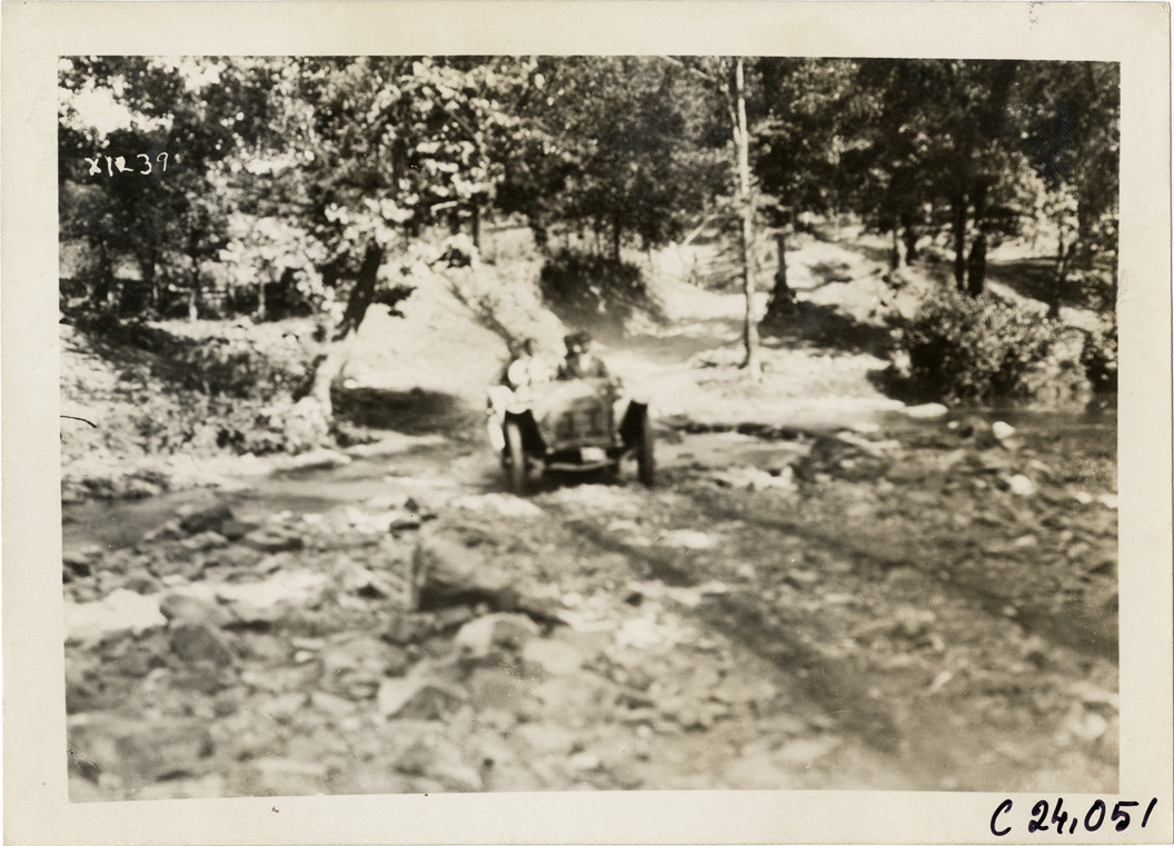 View of motorists in Ohio car no. 11 crossing river or creek during the 1910 Glidden Tour. Stamped on back: "Spooner & Wells, Inc., photographers, telephone North 1745. 1231 Woodward Ave., Detroit, Mich. Detroit, 1231 Woodward, New York, 1931 Broadway." Handwritten on back: "Tours--Glidden Tour, 1910."