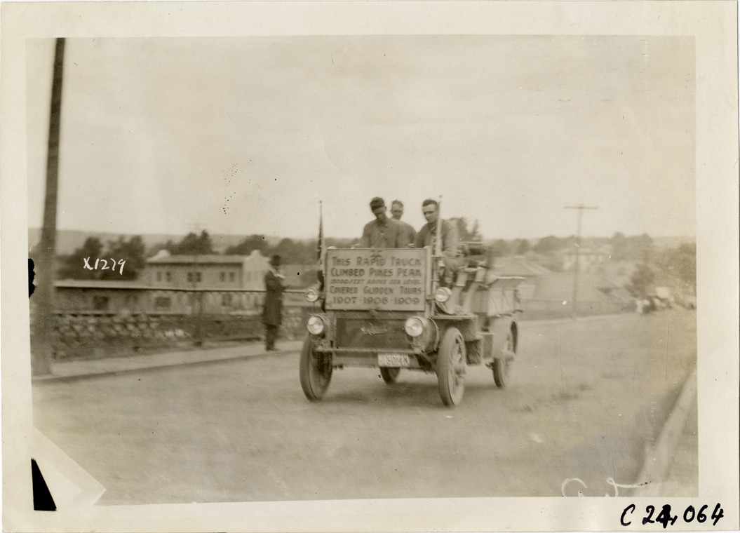 Favorite this☆ Motorists in Rapid truck, 1910 Glidden Tour Description: View of motorists in Rapid truck traveling on road during the 1910 Glidden Tour. Sign on truck reads: "This Rapid truck climbed Pikes Peak, 15,000 feet above sea level covered Glidden Tours 1907, 1908, 1909." Stamped on back: "Spooner & Wells, Inc., photographers, telephone North 1745. 1231 Woodward Ave., Detroit, Mich. Detroit, 1231 Woodward, New York, 1931 Broadway." Handwritten on back: "Tours--Glidden Tour, 1910." Details Resource ID: na025296 Creator: Spooner & Wells Subject: Trucks Rapid Motor Truck Company Glidden Tour (1910) Automobile driving--Competitions--United States Photographers--Michigan--Detroit Photographic prints Date Issued: 1910 Format: 1 photographic print ; 5 x 7 in. Member of: National Automotive History Collection Lazarnick Collection Filing Location: Tours--Glidden Tour, 1910 #29 Negative Number: Negative #C24,064 Rights: Physical rights are retained by DPL. Copyright is retained in accordance with U.S. copyright laws.