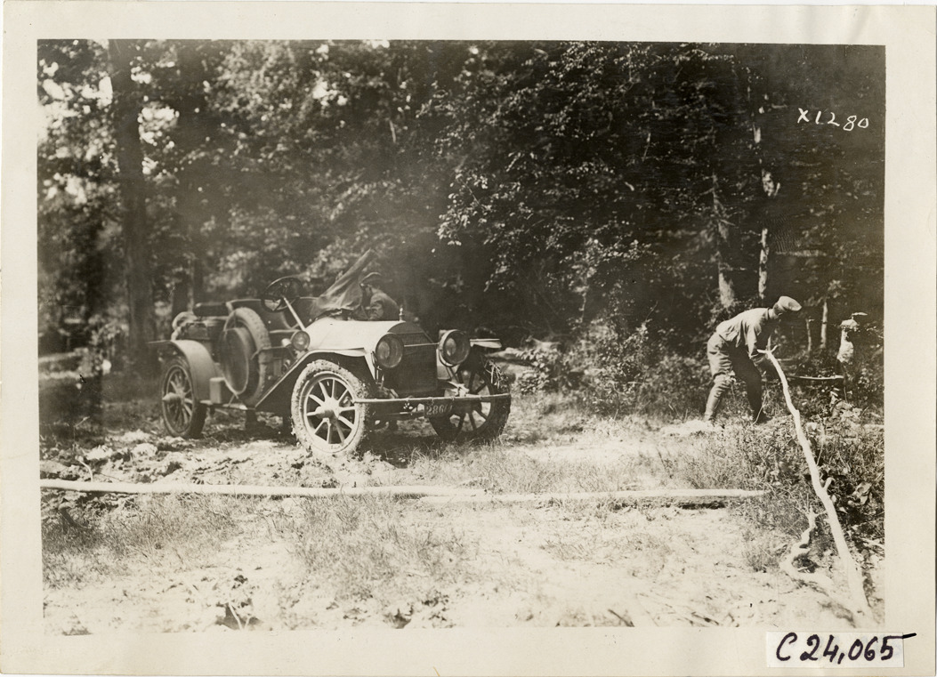 View of motorists with car in forest during the 1910 Glidden Tour. Stamped on back: "Spooner & Wells, Inc., photographers, telephone North 1745. 1231 Woodward Ave., Detroit, Mich. Detroit, 1231 Woodward, New York, 1931 Broadway." Handwritten on back: "Tours--Glidden Tour, 1910."