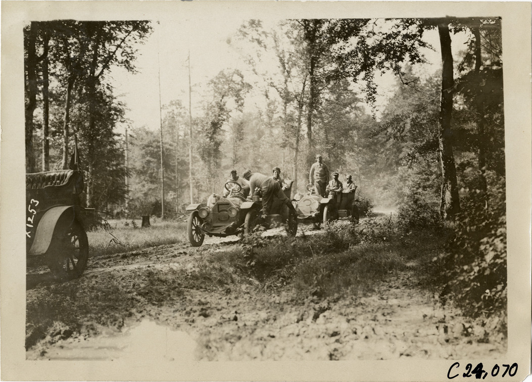 Favorite this☆ Motorists in Chalmers automobiles traveling on forest road, 1910 Glidden Tour Description: View of motorists in Chalmers cars no. 5 and no. 3 traveling on forest road during the 1910 Glidden Tour. Handwritten on back: "Tours--Glidden Tour, 1910." Details Resource ID: na025302 Subject: Automobiles Chalmers Motor Company Forest roads Glidden Tour (1910) Automobile driving--Competitions--United States Photographic prints Date Issued: 1910 Format: 1 photographic print ; 5 x 7 in. Member of: National Automotive History Collection Lazarnick Collection Filing Location: Tours--Glidden Tour, 1910 #29 Negative Number: Negative #C24,070 Rights: Physical rights are retained by DPL. Copyright is retained in accordance with U.S. copyright laws.