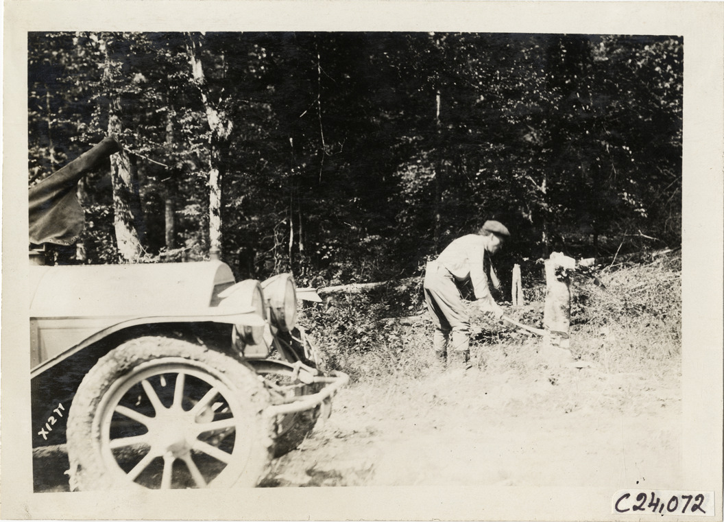 View of motorist chopping tree in forest during the 1910 Glidden Tour. Car is partially visible on left. Stamped on back: "Spooner & Wells, Inc., photographers, telephone North 1745. 1231 Woodward Ave., Detroit, Mich. Detroit, 1231 Woodward, New York, 1931 Broadway." Handwritten on back: "Tours--Glidden Tour, 1910."