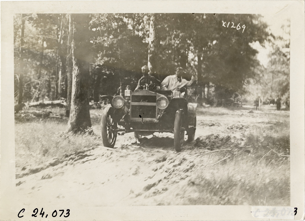 View of motorists in Maxwell car traveling on forest road during the 1910 Glidden Tour. Stamped on back: "Spooner & Wells, Inc., photographers, telephone North 1745. 1231 Woodward Ave., Detroit, Mich. Detroit, 1231 Woodward, New York, 1931 Broadway." Handwritten on back: "Tours--Glidden Tour, 1910."