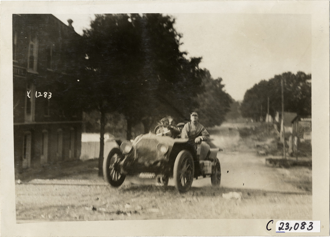 View of motorists in car traveling on road during the 1910 Glidden Tour. Stamped on back: "Spooner & Wells, Inc., photographers, telephone North 1745. 1231 Woodward Ave., Detroit, Mich. Detroit, 1231 Woodward, New York, 1931 Broadway." Handwritten on back: "Tours--Glidden Tour, 1910."
