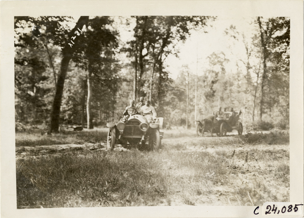 View of motorists in cars traveling on forest road during the 1910 Glidden Tour. Stamped on back: "Spooner & Wells, Inc., photographers, telephone North 1745. 1231 Woodward Ave., Detroit, Mich. Detroit, 1231 Woodward, New York, 1931 Broadway." Handwritten on back: "Tours--Glidden Tour, 1910."