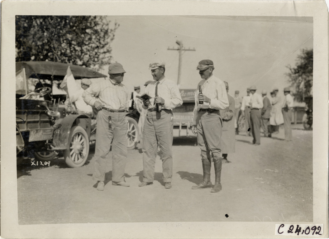 View of Dai H. Lewis speaking with two motorists during the 1910 Glidden Tour. Each motorist holds a bottle; man in center also holds a small book. Stamped on back: "Spooner & Wells, Inc., photographers, telephone North 1745. 1231 Woodward Ave., Detroit, Mich. Detroit, 1231 Woodward, New York, 1931 Broadway." Handwritten on back: "Tours--Glidden Tour, 1910."