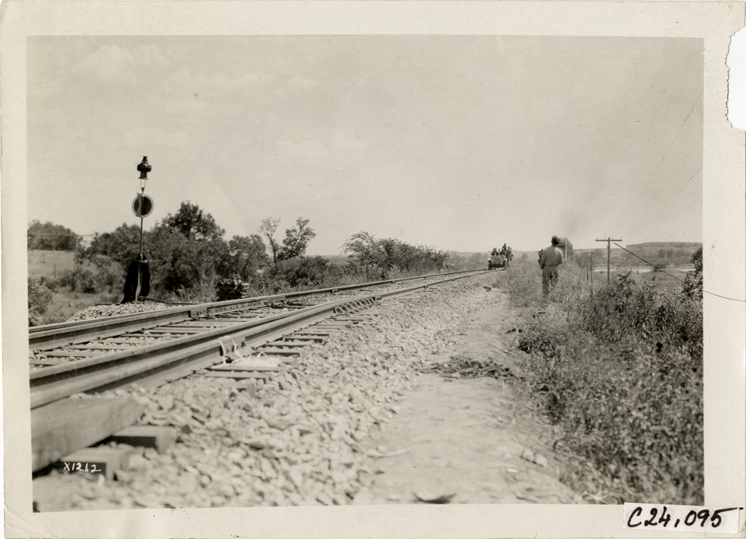 Distant view of motorists in car traveling on railroad tracks during the 1910 Glidden Tour. Signal in foreground. Stamped on back: "Spooner & Wells, Inc., photographers, telephone North 1745. 1231 Woodward Ave., Detroit, Mich. Detroit, 1231 Woodward, New York, 1931 Broadway." Handwritten on back: "Tours--Glidden Tour, 1910."