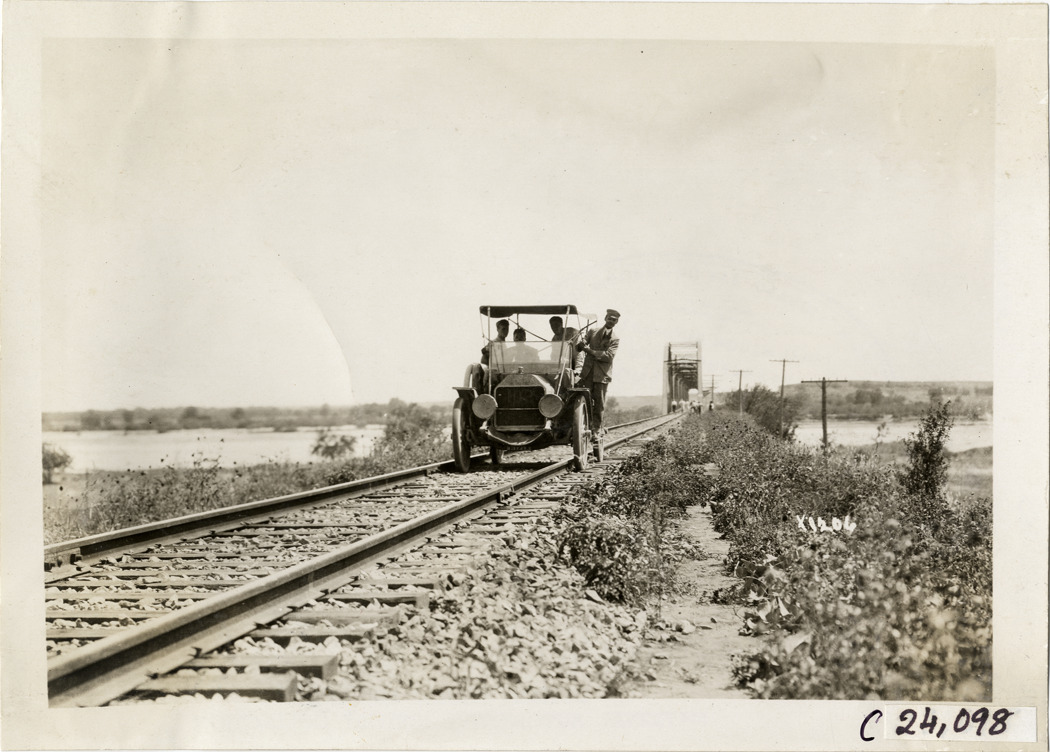 View of motorists in Moline car no. 102 traveling on railroad tracks during the 1910 Glidden Tour. Railroad bridge in background. Stamped on back: "Spooner & Wells, Inc., photographers, telephone North 1745. 1231 Woodward Ave., Detroit, Mich. Detroit, 1231 Woodward, New York, 1931 Broadway." Handwritten on back: "#102 Moline. Tours--Glidden Tour, 1910."