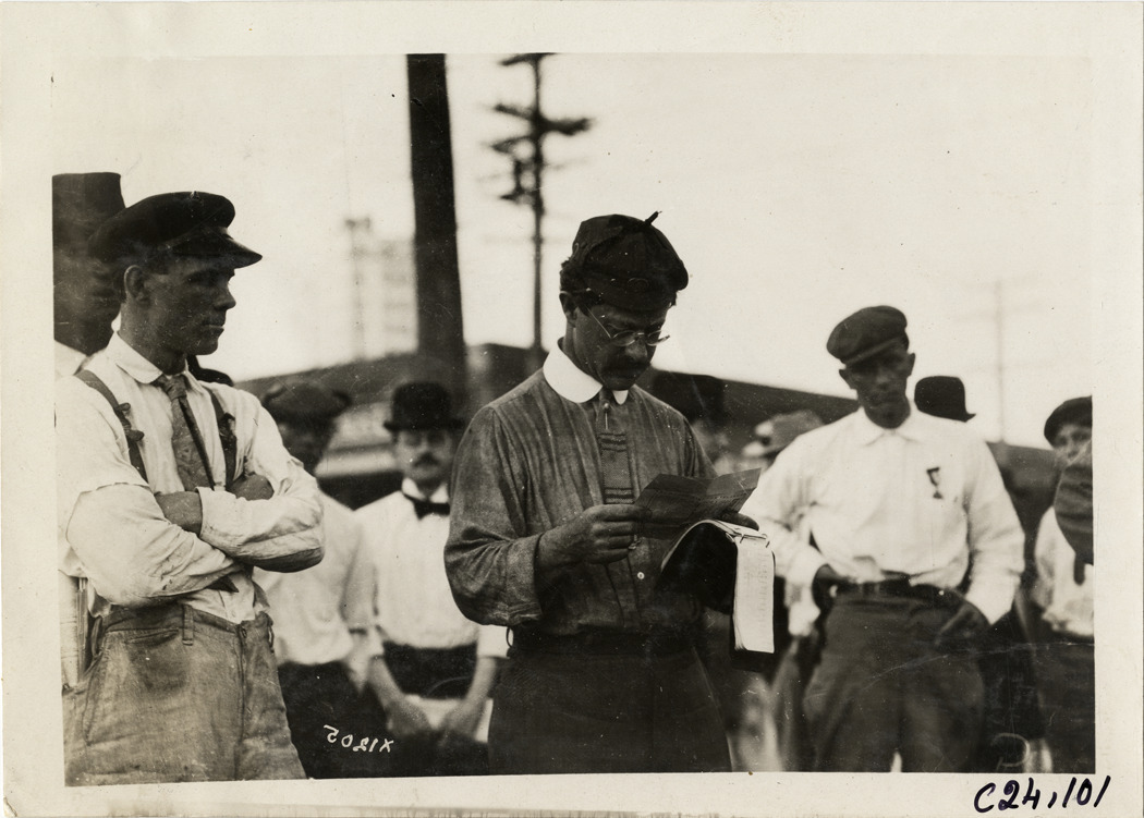View of E.L. Ferguson examining a document during the 1910 Glidden Tour. Several men stand in background. Stamped on back: "Spooner & Wells, Inc., photographers, telephone North 1745. 1231 Woodward Ave., Detroit, Mich. Detroit, 1231 Woodward, New York, 1931 Broadway." Handwritten on back: "Mr. Ferguson. Tours--Glidden Tour, 1910."