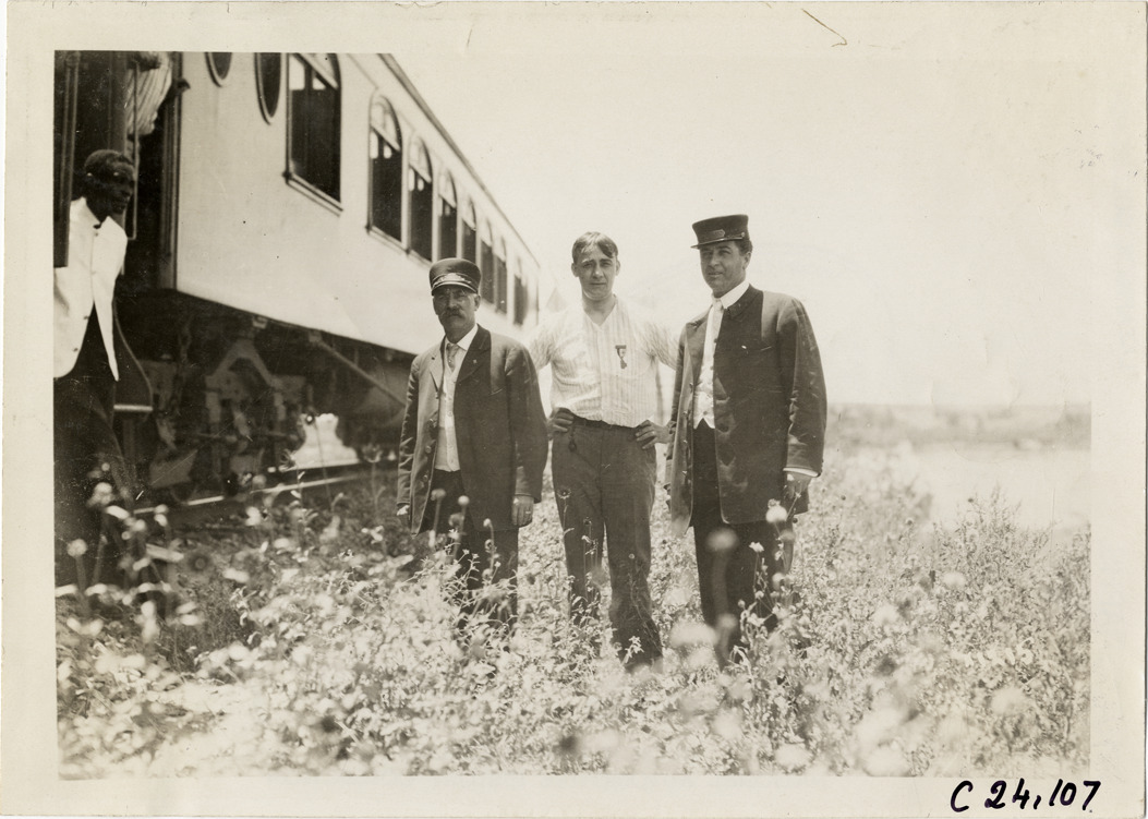 View of motorist posing with two railroad employees, possibly conductors, during the 1910 Glidden Tour. Railroad passenger car in background. Stamped on back: "Spooner & Wells, Inc., photographers, telephone North 1745. 1231 Woodward Ave., Detroit, Mich. Detroit, 1231 Woodward, New York, 1931 Broadway." Handwritten on back: "#2. Tours--Glidden Tour, 1910."