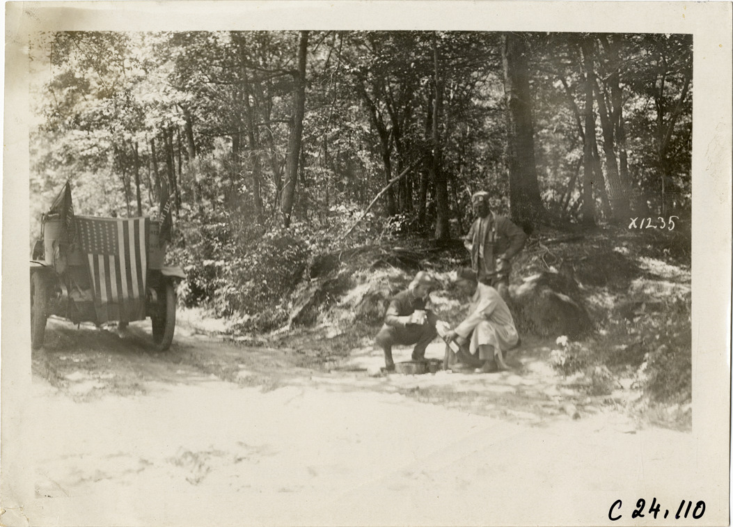 View of motorists sharing thermos bottle on roadside during the 1910 Glidden Tour. Car, draped with an American flag, is parked on roadside. Stamped on back: "Spooner & Wells, Inc., photographers, telephone North 1745. 1231 Woodward Ave., Detroit, Mich. Detroit, 1231 Woodward, New York, 1931 Broadway." Handwritten on back: "Tours--Glidden Tour, 1910."