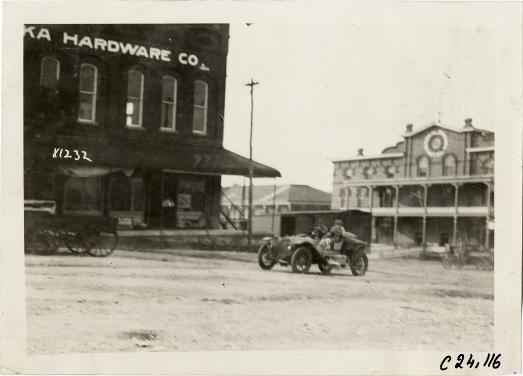 View of motorists in car in front of Iuka Hardware Co. building during the 1910 Glidden Tour. Mineral Springs Hotel in background. Handwritten on back: "Tours--Glidden Tour, 1910."
