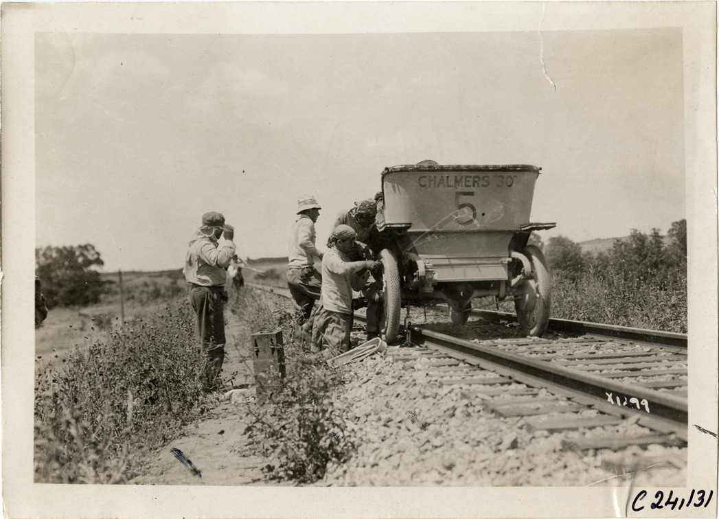 View of motorists with Chalmers "30" car no. 5 on railroad tracks during the 1910 Glidden Tour. Stamped on back: "Spooner & Wells, Inc., photographers, telephone North 1745. 1231 Woodward Ave., Detroit, Mich. Detroit, 1231 Woodward, New York, 1931 Broadway." Handwritten on back: "Tours--Glidden Tour, 1910."