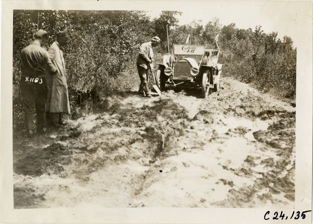 View of motorist trying to dislodge Cutting "40" car from muddy rural road with shovel during the 1910 Glidden Tour. Stamped on back: "Spooner & Wells, Inc., photographers, telephone North 1745. 1231 Woodward Ave., Detroit, Mich. Detroit, 1231 Woodward, New York, 1931 Broadway." Handwritten on back: "Tours--Glidden Tour, 1910."