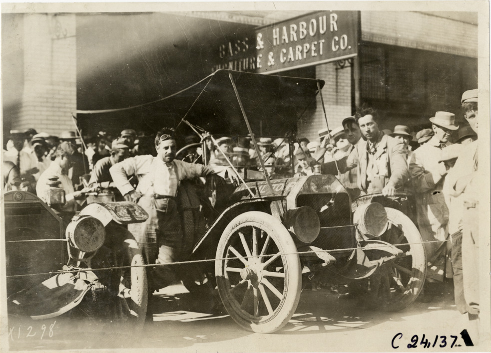 View of motorists posing with Moline car no. 101 in front of Bass & Harbor Furniture and Carpet Co. building during the 1910 Glidden Tour. Spectators stand in background. Stamped on back: "Spooner & Wells, Inc., photographers, telephone North 1745. 1231 Woodward Ave., Detroit, Mich. Detroit, 1231 Woodward, New York, 1931 Broadway." Handwritten on back: "Tours--Glidden Tour, 1910."
