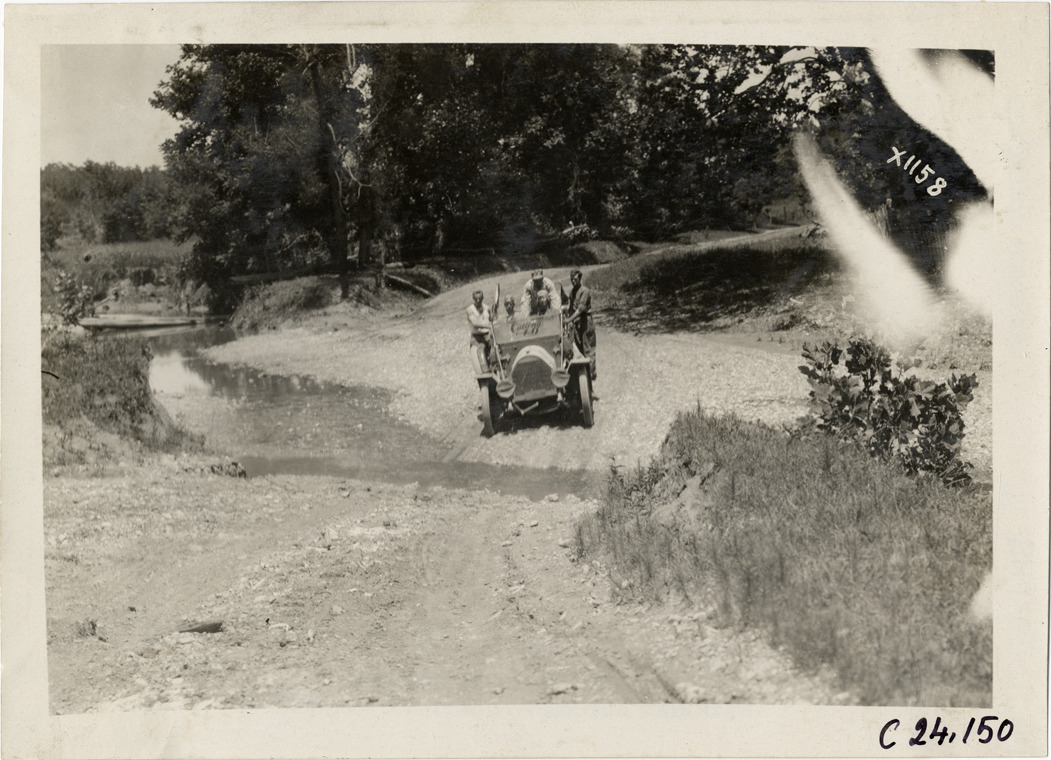 View of motorists in Cutting "40" car crossing creek that traverses rural dirt road during the 1910 Glidden Tour. Stamped on back: "Spooner & Wells, Inc., photographers, telephone North 1745. 1231 Woodward Ave., Detroit, Mich. Detroit, 1231 Woodward, New York, 1931 Broadway." Handwritten on back: "Tours--Glidden Tour, 1910."