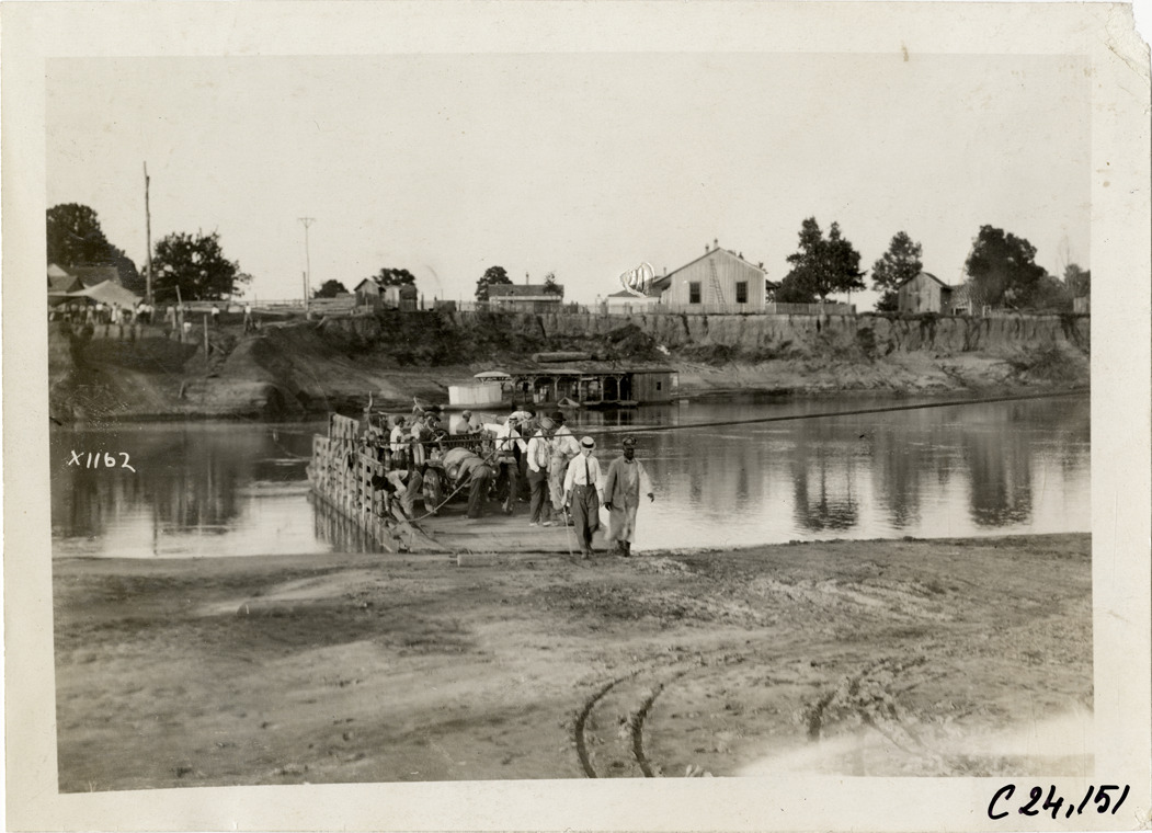 View of motorists with car on river barge next to shoreline during the 1910 Glidden Tour. Houses, buildings and boat slips are visible on opposite shore. Stamped on back: "Spooner & Wells, Inc., photographers, telephone North 1745. 1231 Woodward Ave., Detroit, Mich. Detroit, 1231 Woodward, New York, 1931 Broadway." Handwritten on back: "Tours--Glidden Tour, 1910."
