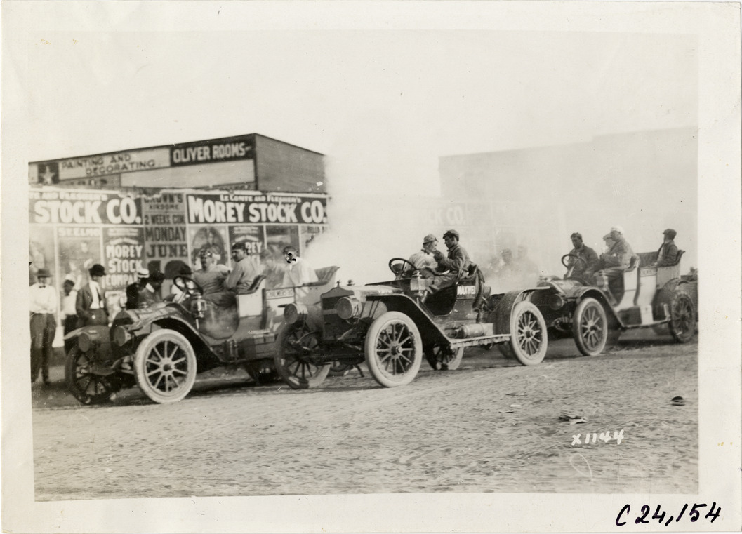 View of motorists in Chalmers and Maxwell cars during the 1910 Glidden Tour. Billboards in background. Stamped on back: "Spooner & Wells, Inc., photographers, telephone North 1745. 1231 Woodward Ave., Detroit, Mich. Detroit, 1231 Woodward, New York, 1931 Broadway." Handwritten on back: "Tours--Glidden Tour, 1910."