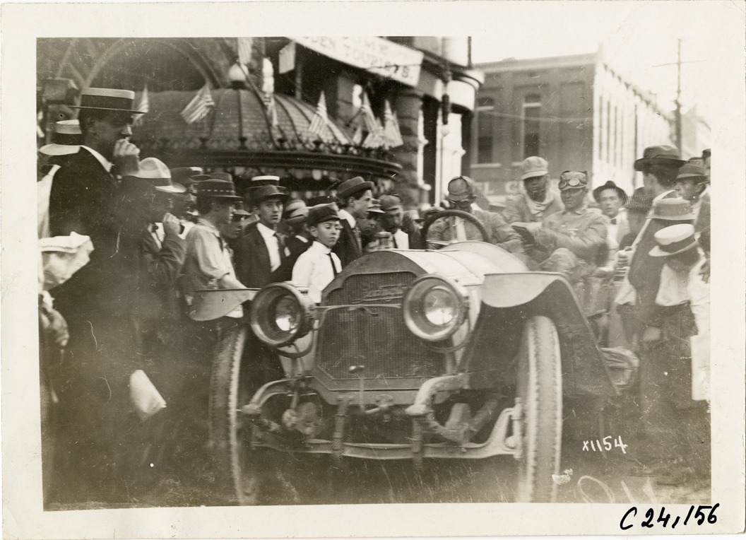 View of motorists in Lexington car no. 103, surrounded by spectators, during the 1910 Glidden Tour. Stamped on back: "Spooner & Wells, Inc., photographers, telephone North 1745. 1231 Woodward Ave., Detroit, Mich. Detroit, 1231 Woodward, New York, 1931 Broadway." Handwritten on back: "Tours--Glidden Tour, 1910."