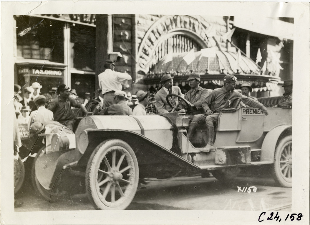 View of motorists in Premier car during the 1910 Glidden Tour. Spectators and building with ornate awning in background. Stamped on back: "Spooner & Wells, Inc., photographers, telephone North 1745. 1231 Woodward Ave., Detroit, Mich. Detroit, 1231 Woodward, New York, 1931 Broadway." Handwritten on back: "Tours--Glidden Tour, 1910."