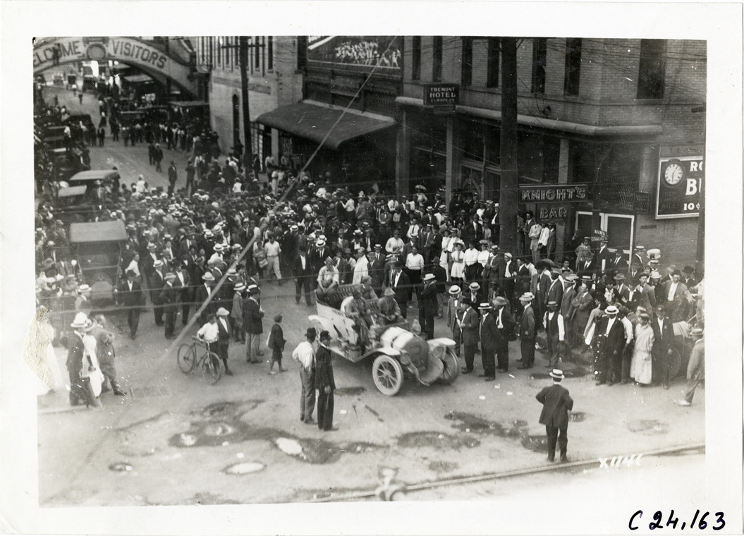 Bird's-eye view of crowd of spectators surrounding cars in street during the 1910 Glidden Tour. Tremont Hotel, Knight's Bar and "Welcome, visitors" arch in background. Stamped on back: "Spooner & Wells, Inc., photographers, telephone North 1745. 1231 Woodward Ave., Detroit, Mich. Detroit, 1231 Woodward, New York, 1931 Broadway." Handwritten on back: "Tours--Glidden Tour, 1910."