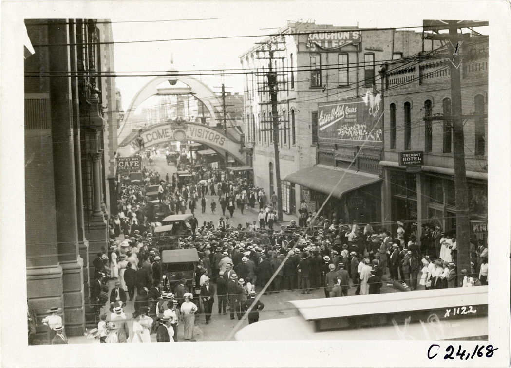 Bird's-eye view of crowd of spectators surrounding cars in street during the 1910 Glidden Tour. Tremont Hotel and "Welcome, visitors" arch in background. Stamped on back: "Spooner & Wells, Inc., photographers, telephone North 1745. 1231 Woodward Ave., Detroit, Mich. Detroit, 1231 Woodward, New York, 1931 Broadway." Handwritten on back: "Tours--Glidden Tour, 1910."