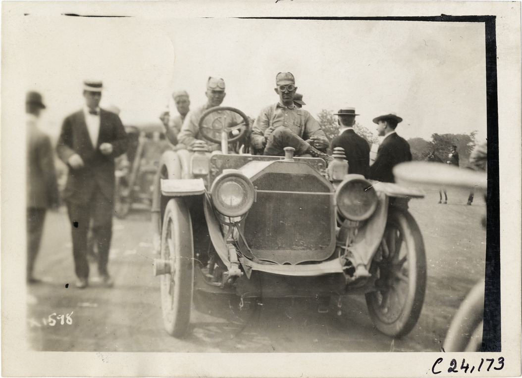 View of motorists posing in car during the 1910 Glidden Tour. Stamped on back: "Spooner & Wells, Inc., photographers, telephone North 1745. 1231 Woodward Ave., Detroit, Mich. Detroit, 1231 Woodward, New York, 1931 Broadway." Handwritten on back: "Tours--Glidden Tour, 1910."