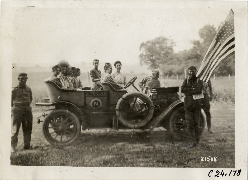 View of women posing in Chalmers car no. 3 on roadside during the 1910 Glidden Tour. Motorists stand next to car; American flag is visible on right. Stamped on back: "Spooner & Wells, Inc., photographers, telephone North 1745. 1231 Woodward Ave., Detroit, Mich. Detroit, 1231 Woodward, New York, 1931 Broadway." Handwritten on back: "Tours--Glidden Tour, 1910."