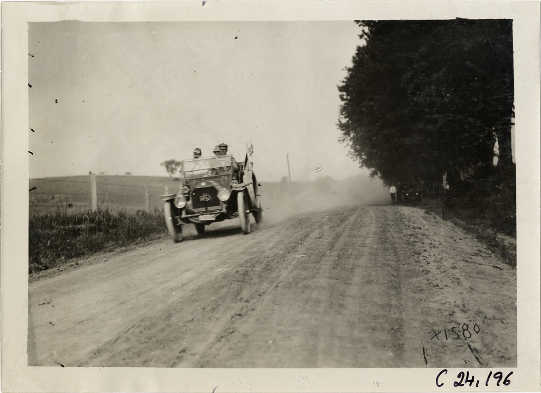 View of motorists in Reo car traveling on rural dirt road during the 1910 Glidden Tour. Stamped on back: "Spooner & Wells, Inc., photographers, telephone North 1745. 1231 Woodward Ave., Detroit, Mich. Detroit, 1231 Woodward, New York, 1931 Broadway." Handwritten on back: "Tours--Glidden Tour, 1910."