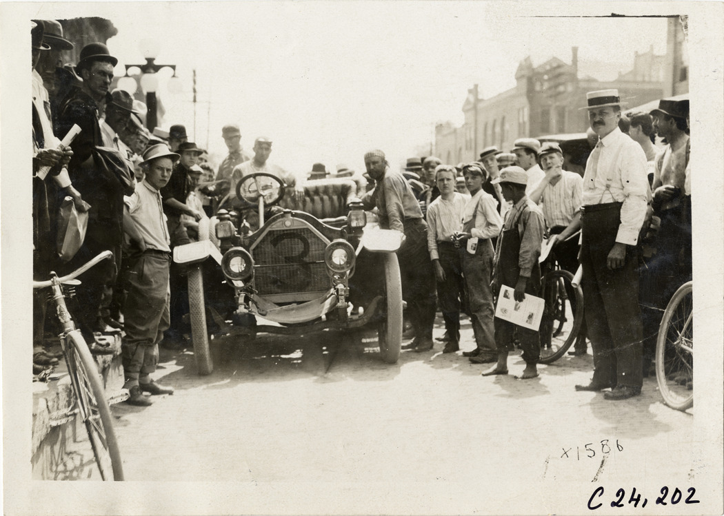 View of motorists in Chalmers car no. 3, surrounded by spectators, during the 1910 Glidden Tour. Stamped on back: "Spooner & Wells, Inc., photographers, telephone North 1745. 1231 Woodward Ave., Detroit, Mich. Detroit, 1231 Woodward, New York, 1931 Broadway." Handwritten on back: "Tours--Glidden Tour, 1910."