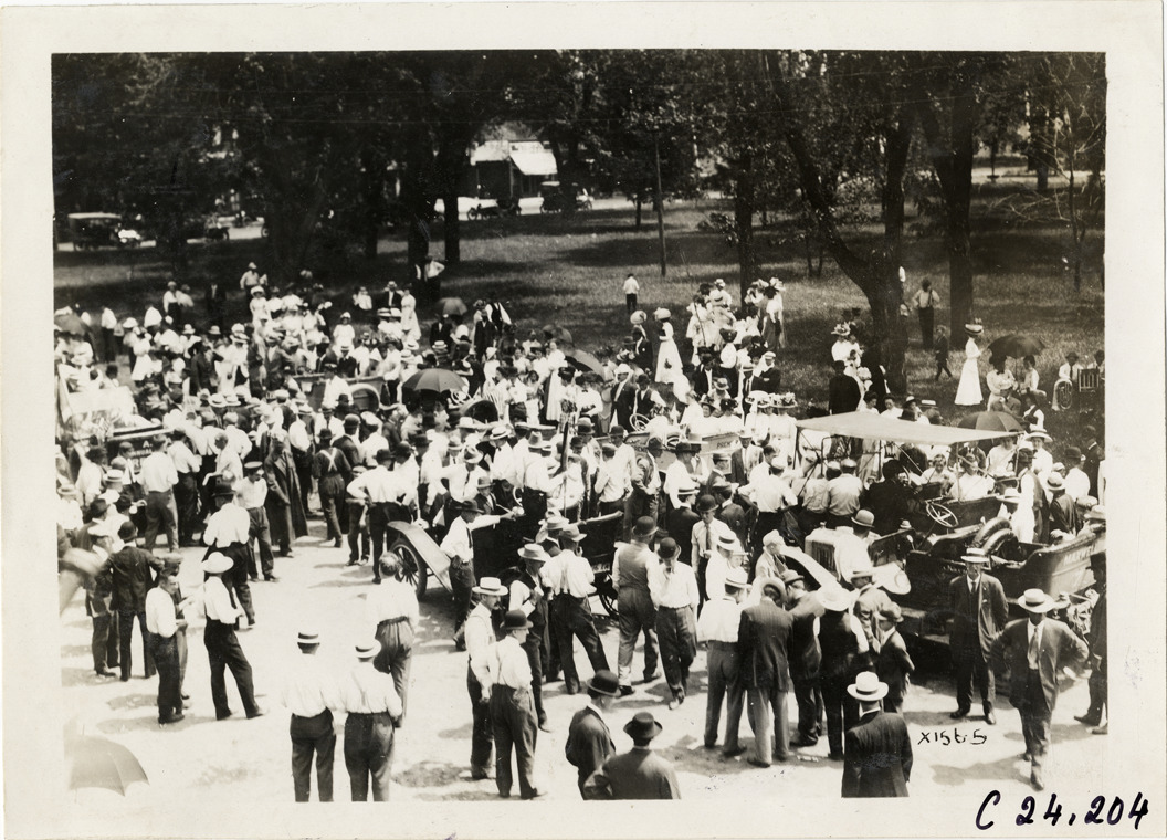 View of crowd of spectators surrounding cars in street during the 1910 Glidden Tour. Park in background. Stamped on back: "Spooner & Wells, Inc., photographers, telephone North 1745. 1231 Woodward Ave., Detroit, Mich. Detroit, 1231 Woodward, New York, 1931 Broadway." Handwritten on back: "Tours--Glidden Tour, 1910."