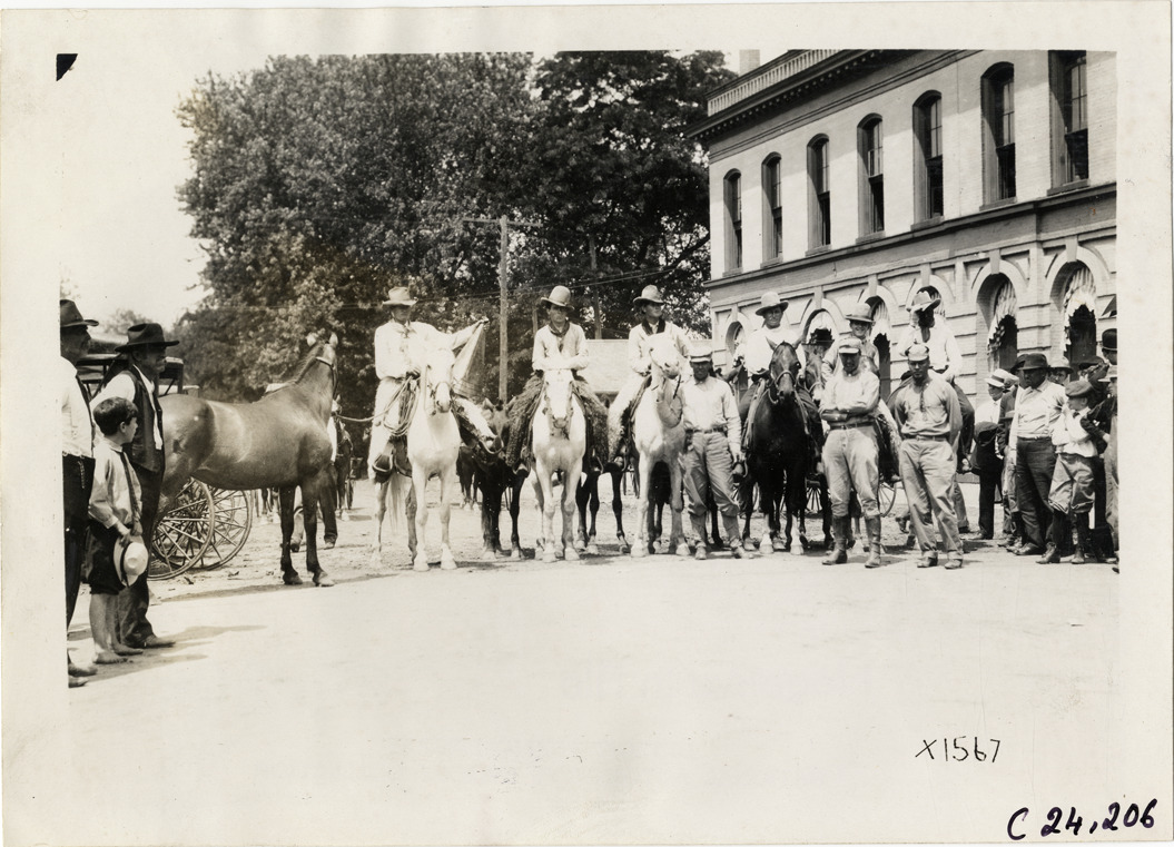 View of men on horseback, wearing wide-brimmed hats, posing with several motorists during the 1910 Glidden Tour. Spectators in background. Stamped on back: "Spooner & Wells, Inc., photographers, telephone North 1745. 1231 Woodward Ave., Detroit, Mich. Detroit, 1231 Woodward, New York, 1931 Broadway." Handwritten on back: "Tours--Glidden Tour, 1910."