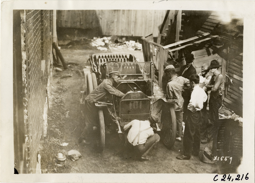 Motorists repairing Moline automobile, 1910 Glidden Tour