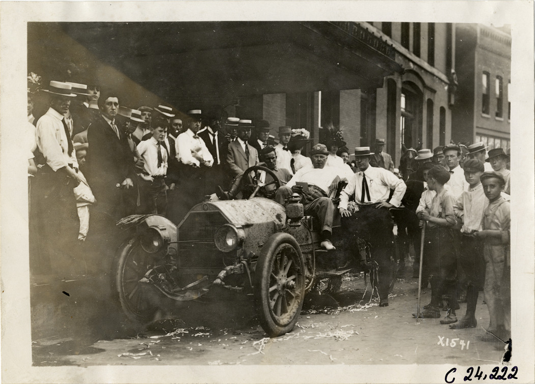 View of Dai H. Lewis and motorists posing in car, surrounded by spectators, during the 1910 Glidden Tour. Stamped on back: "Spooner & Wells, Inc., photographers, telephone North 1745. 1231 Woodward Ave., Detroit, Mich. Detroit, 1231 Woodward, New York, 1931 Broadway." Handwritten on back: "Tours--Glidden Tour, 1910."