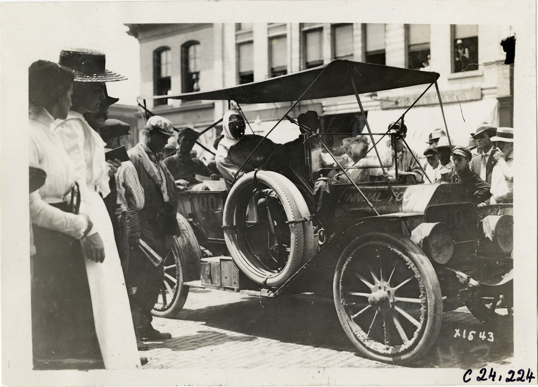 View of motorists posing in Moline car no. 100, surrounded by spectators, during the 1910 Glidden Tour. Stamped on back: "Spooner & Wells, Inc., photographers, telephone North 1745. 1231 Woodward Ave., Detroit, Mich. Detroit, 1231 Woodward, New York, 1931 Broadway." Handwritten on back: "Tours--Glidden Tour, 1910."