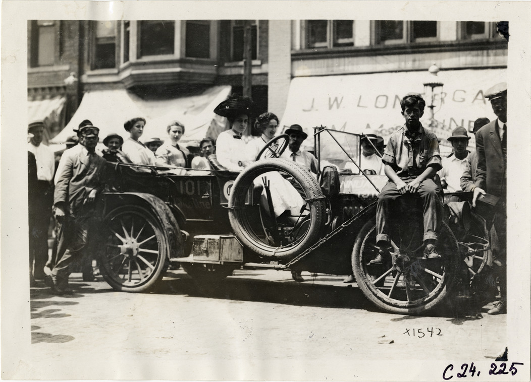 View of women posing in Moline car no. 101 during the 1910 Glidden Tour. One motorist sits on front tire, another leans against rear of car. Spectators in background. Stamped on back: "Spooner & Wells, Inc., photographers, telephone North 1745. 1231 Woodward Ave., Detroit, Mich. Detroit, 1231 Woodward, New York, 1931 Broadway." Handwritten on back: "Tours--Glidden Tour, 1910."