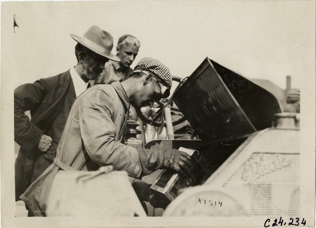 Close-up view of motorist adding oil to car during the 1910 Glidden Tour. Another man looks over his shoulder. Stamped on back: "Spooner & Wells, Inc., photographers, telephone North 1745. 1231 Woodward Ave., Detroit, Mich. Detroit, 1231 Woodward, New York, 1931 Broadway." Handwritten on back: "Tours--Glidden Tour, 1910."