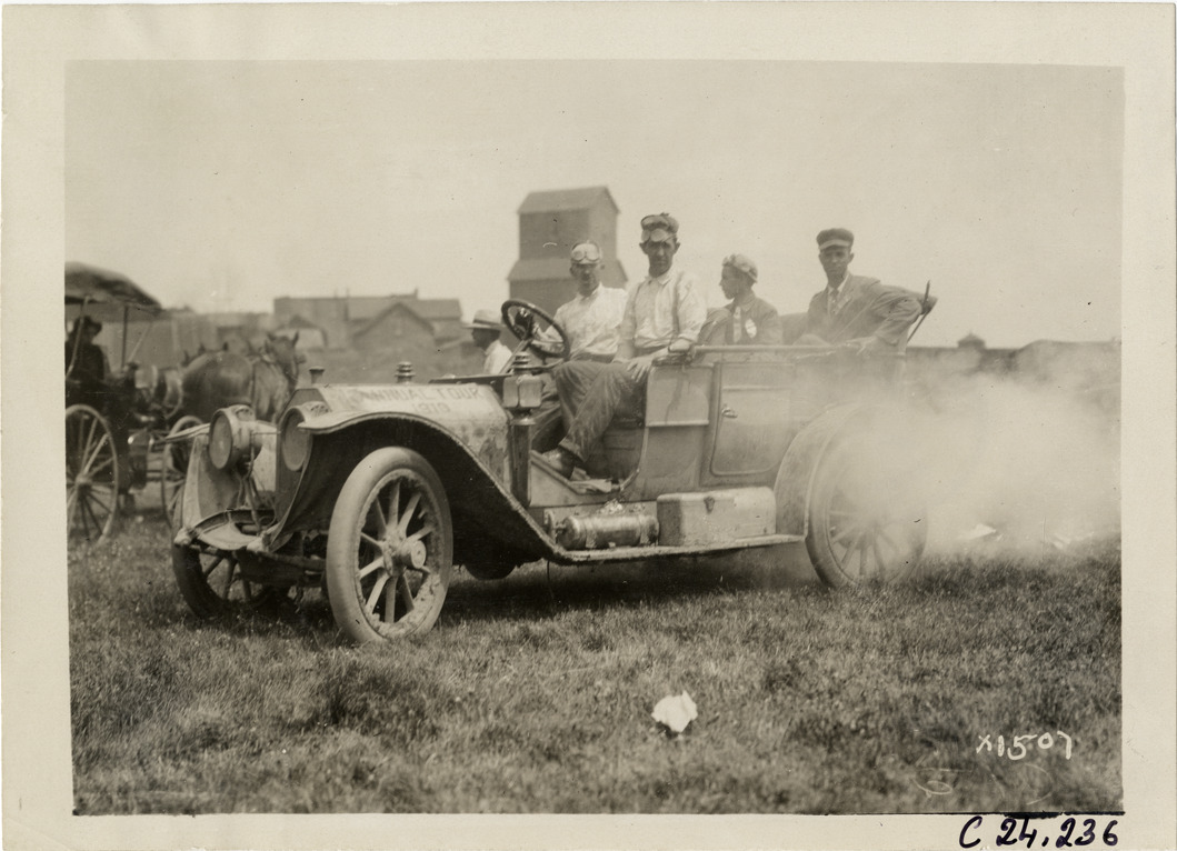 View of motorists posing in car during the 1910 Glidden Tour. Stamped on back: "Spooner & Wells, Inc., photographers, telephone North 1745. 1231 Woodward Ave., Detroit, Mich. Detroit, 1231 Woodward, New York, 1931 Broadway." Handwritten on back: "Tours--Glidden Tour, 1910."