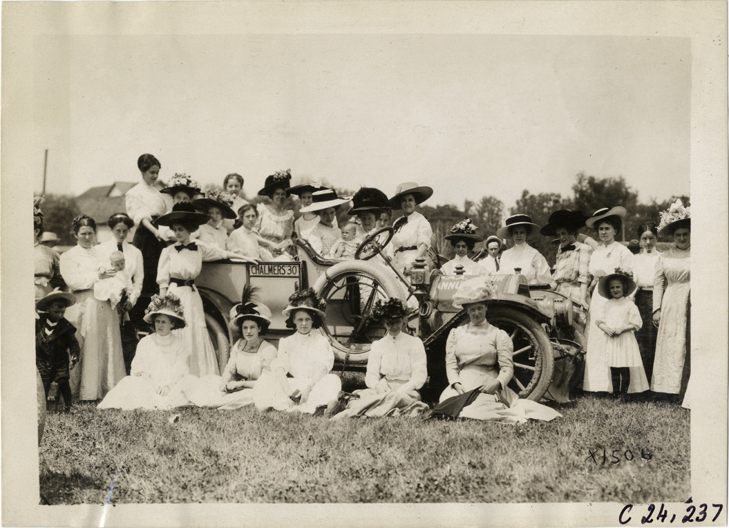 View of group of women and girls posing with Chalmers "30" car during the 1910 Glidden Tour. Stamped on back: "Spooner & Wells, Inc., photographers, telephone North 1745. 1231 Woodward Ave., Detroit, Mich. Detroit, 1231 Woodward, New York, 1931 Broadway." Handwritten on back: "Tours--Glidden Tour, 1910."