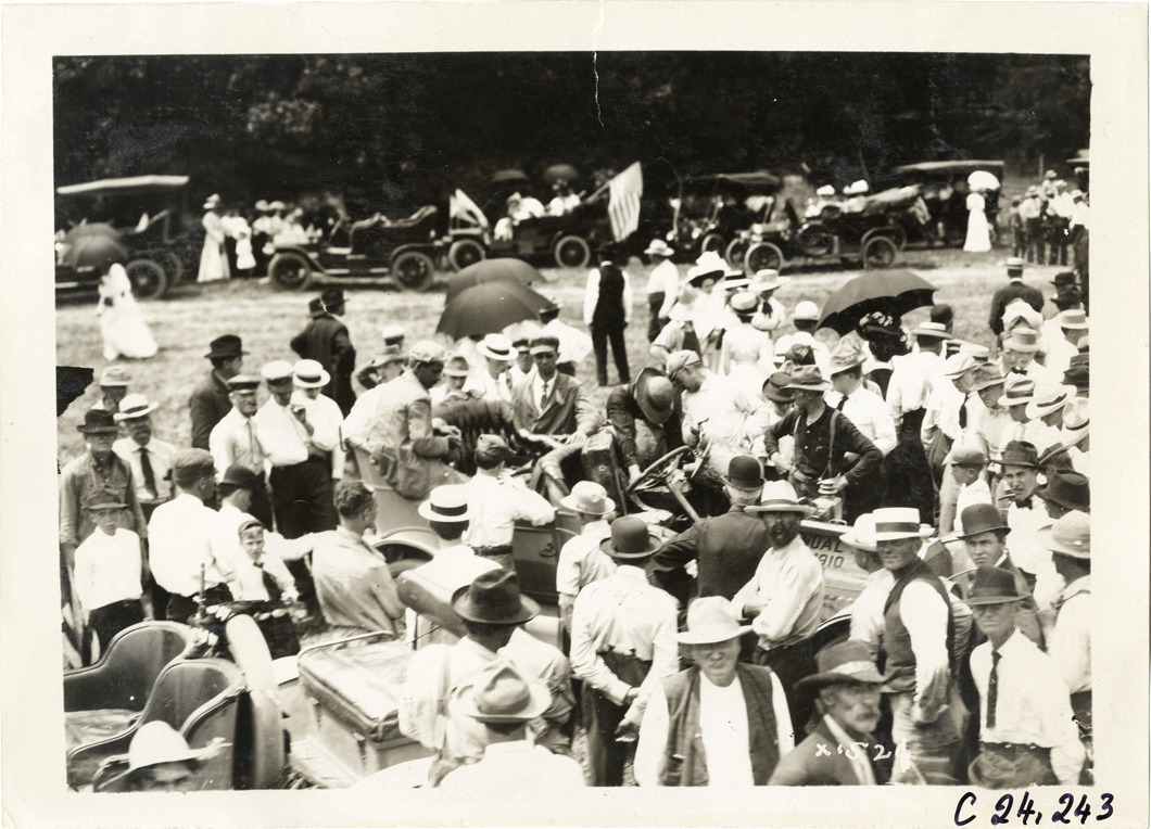 View of crowd of spectators surrounding cars in field during the 1910 Glidden Tour. Stamped on back: "Spooner & Wells, Inc., photographers, telephone North 1745. 1231 Woodward Ave., Detroit, Mich. Detroit, 1231 Woodward, New York, 1931 Broadway." Handwritten on back: "Tours--Glidden Tour, 1910."
