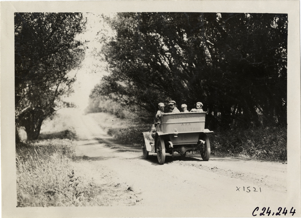 Rear view of motorists in Cino car no. 15 on rural dirt road during the 1910 Glidden Tour. Stamped on back: "Spooner & Wells, Inc., photographers, telephone North 1745. 1231 Woodward Ave., Detroit, Mich. Detroit, 1231 Woodward, New York, 1931 Broadway." Handwritten on back: "Tours--Glidden Tour, 1910."