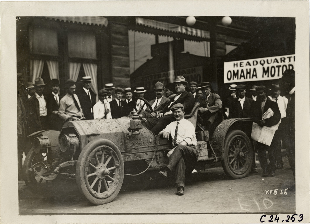 View of motorists posing with car in front of Omaha Motor Club headquarters at Omaha, Nebraska during the 1910 Glidden Tour. Spectators stand in background. Stamped on back: "Spooner & Wells, Inc., photographers, telephone North 1745. 1231 Woodward Ave., Detroit, Mich. Detroit, 1231 Woodward, New York, 1931 Broadway." Handwritten on back: "Tours--Glidden Tour, 1910."