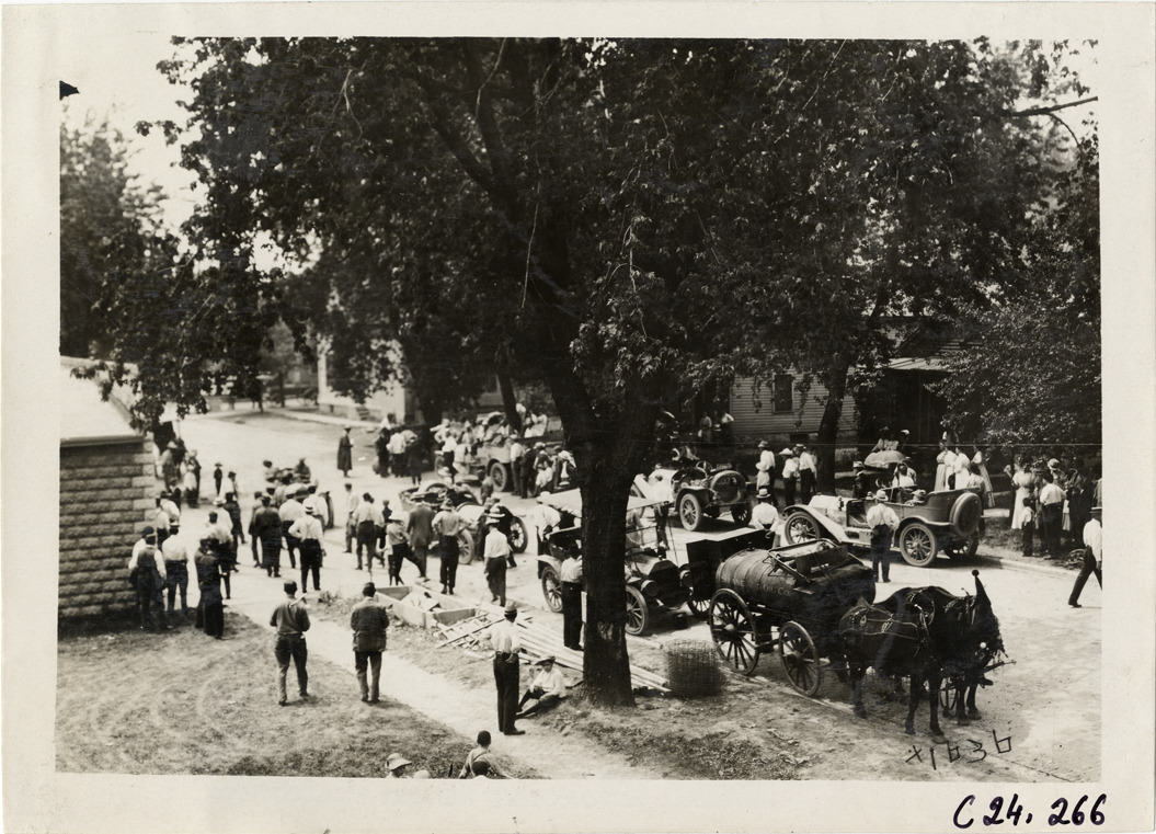 View of spectators looking at cars and horse-drawn Standard Oil wagon lined up in street during the 1910 Glidden Tour. Stamped on back: "Spooner & Wells, Inc., photographers, telephone North 1745. 1231 Woodward Ave., Detroit, Mich. Detroit, 1231 Woodward, New York, 1931 Broadway." Handwritten on back: "Tours--Glidden Tour, 1910."