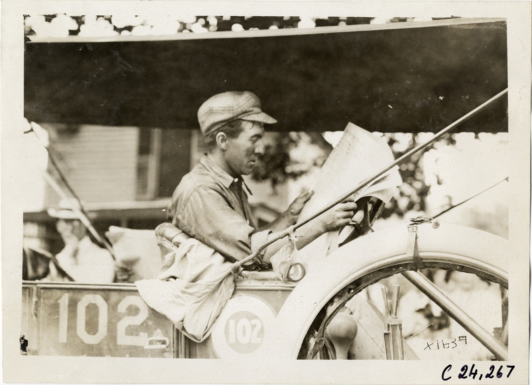 Close-up view of driver reading a newspaper in Moline car no. 102 during the 1910 Glidden Tour. Stamped on back: "Spooner & Wells, Inc., photographers, telephone North 1745. 1231 Woodward Ave., Detroit, Mich. Detroit, 1231 Woodward, New York, 1931 Broadway." Handwritten on back: "Tours--Glidden Tour, 1910."