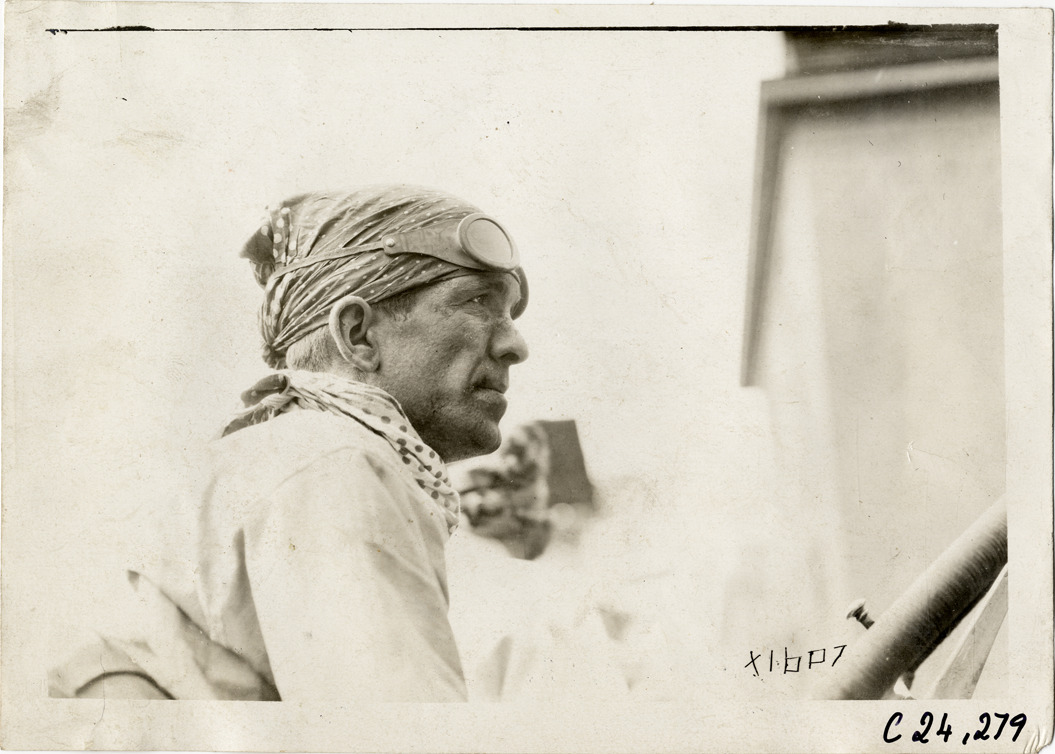Close-up view of driver in car during the 1910 Glidden Tour. Stamped on back: "Spooner & Wells, Inc., photographers, telephone North 1745. 1231 Woodward Ave., Detroit, Mich. Detroit, 1231 Woodward, New York, 1931 Broadway." Handwritten on back: "Tours--Glidden Tour, 1910."
